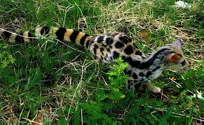 С виду азиатский линзанг больше похож на меховую змею с лапками. Длинная вытянутая тушка, толстый хвостище, узкая хитрая морда, короткие лапки. При длине в метр весит крошка 500-700 граммов. Из привычного кошачьего в звере лишь леопардовая шкурка и пышные усы.