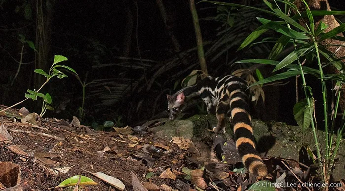 Существуют два вида азиатских линзангов: полосатый и пятнистый. На этом фото, например, полосатый. На фото ниже — пятнистый.