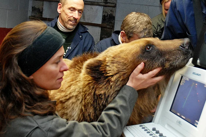 Исследование по изучению геномов медведя в спячке проводили вот так. По глазам мишки понятно, что он в шоке от того, что сейчас происходит.