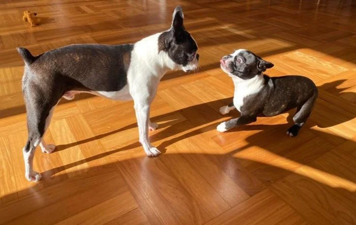 Когда мы брали нового щенка, я переживала, что старший пёс может его напугать
