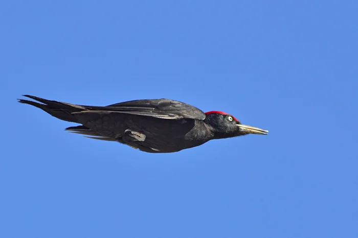 Итак, самый крупный дятел России, желна. Размером примерно с ворону, насыщенно-черный, с красной шапочкой на голове. Самки имеют маленький «беретик», у самцов красное пятно гораздо больше. Молодежь порой и вовсе ходит со скучной черной головой, пока не повзрослеет. Также желна снабжена характерным длинным клювом сероватого окраса, двумя стандартными противопоставленными парами пальцев на каждой лапе, мощным хвостом для упора в ствол и сравнительно короткими крыльями, до 80 см. В лесу ему широкие крылья без надобности, а вне леса любой дятел чувствует себя дискомфортно.