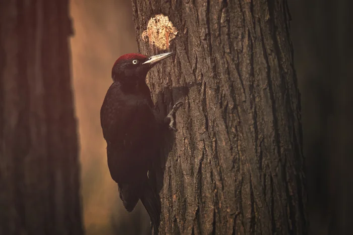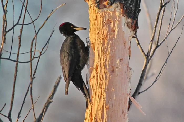 В принципе, черный дятел полностью укомплектован для своей непростой жизненной миссии: спасать лес от нашествия насекомых-ксилофагов, то бишь, древоедов. Кстати, в отличие от своих некрупных собратьев, желна предпочитает бить по стволу размеренными, мощными ударами клюва, без суеты. Таким манером черный дятел может за пару дней полностью демонтировать кору с зараженного дерева, а потом уже с удовольствием приступить к поискам особо крупных личинок в глубоких слоях древесины.