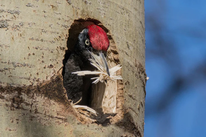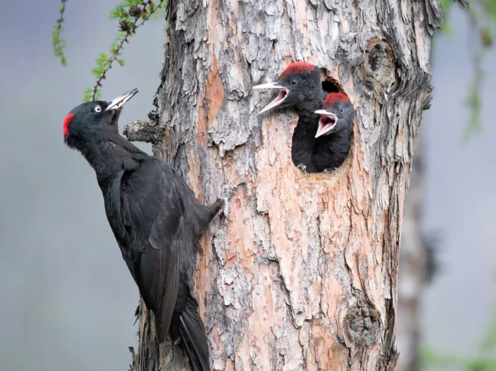 Итак, пара черных дятлов по весне откладывает 4–5 яиц, из которых выводятся маленькие желнята. Около месяца родители поочередно таскают своему голосящему выводку личинок, липкие комки из муравьев и их яиц. Покинув дупло, юные дятлы держатся до конца лета неподалеку от родителей, а потом разлетаются искать себе личную территорию и обзаводиться недвижимостью.