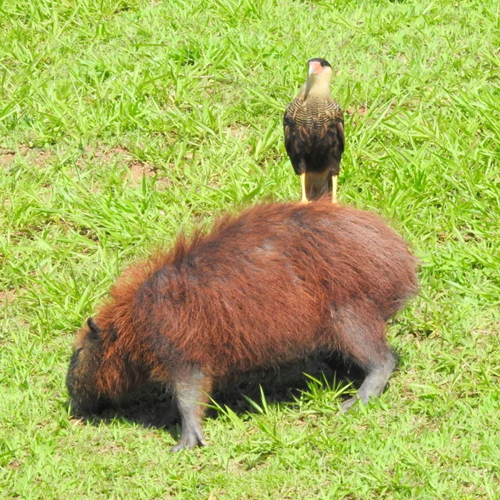 Каракара оценивает, может ли она съесть капибару.