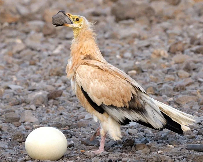 Кроме падали и чужих отходов птицы очень любят яйца. Это поведение у них инстинктивное: как только они понимают, что круглый объект съедобен, их клюв сам тянется к камушку, чтобы разбить скорлупу. Благодаря этому пернатые способны лакомиться самыми крупными яйцами в мире — страусинными.