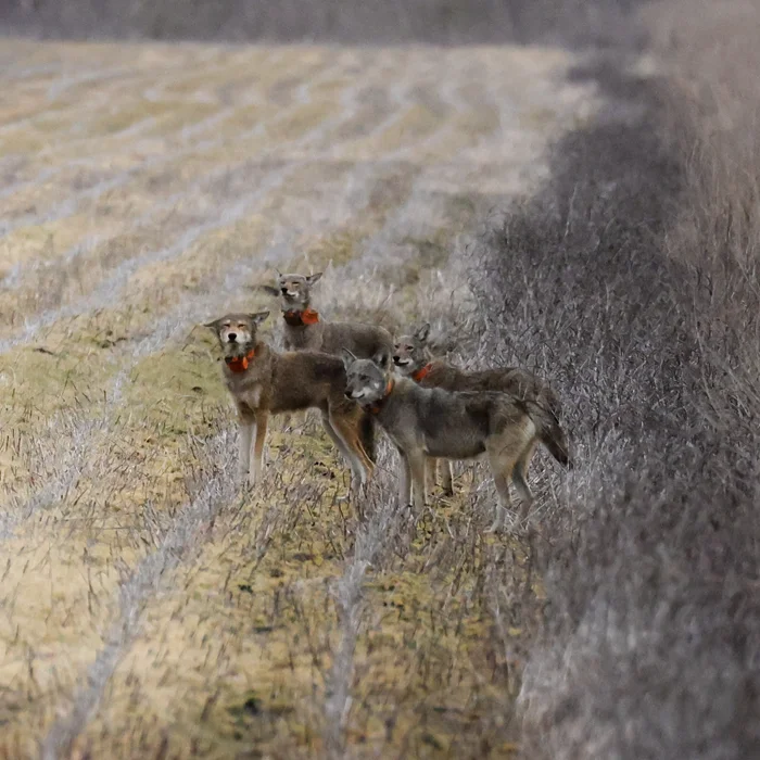Стайка рыжих волков в заказнике на берегу Атлантики.
