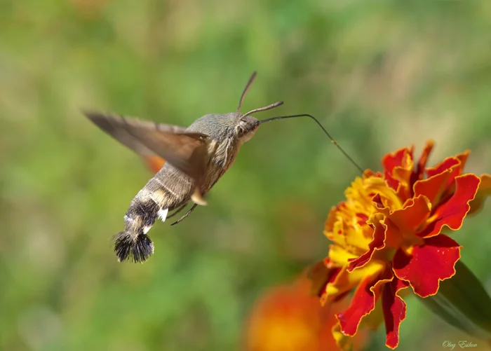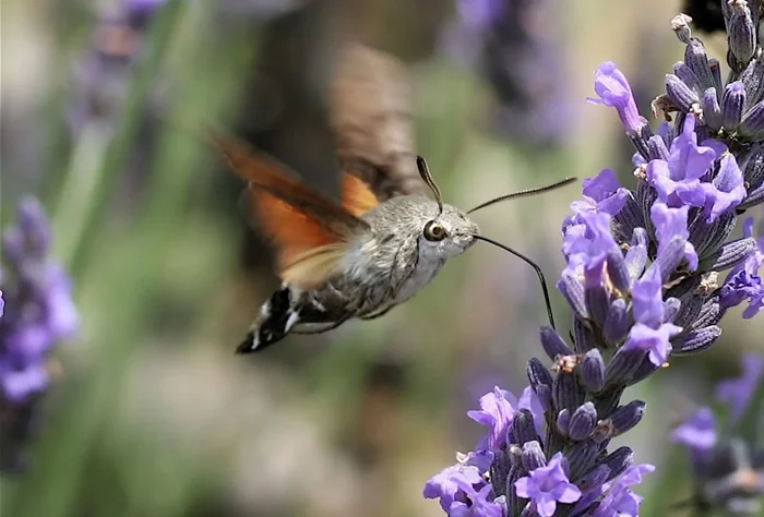 № 2 Языкан обыкновенный: колибри Старого Света. «Окей, гугл, есть ли колибри в России?» — примерно так выглядит запрос тех, кто впервые увидел языкана вживую. Оно и не удивительно: насекомое и птичка действительно очень похожи. И колибри, и бабочка пьют нектар на лету. В этом мотыльку помогают две вещи. Во-первых, длинный хоботок. В расправленном состоянии его длина может быть больше тела насекомого! Во-вторых, мощные мышцы груди. Благодаря им бабочка совершает 70 взмахов крыльями в секунду и способна разогнаться до 60-80 км/ч по прямой!