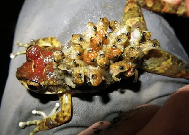 У каждого вида хемифрактид процедура выращивания детей немного отличается. Кто-то буквально засовывает икру себе под кожу, а кто-то просто носит на спине, как особь на фото.