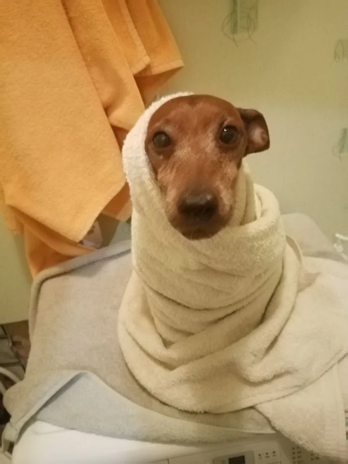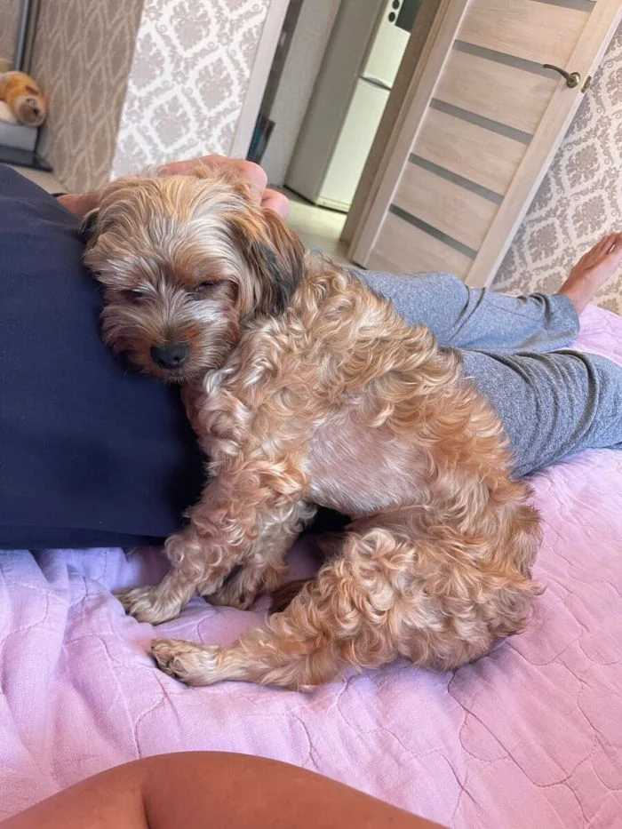 ТА: Нашла на улице. В одном ошейнике без поводка. Жила у меня полгода. Бусинкой назвала. Потом случайно нашлась её настоящая хозяйка, которая тоже долго искала её. Настоящее имя оказалось Боня. А это мы в салоне красоты ещё до счастливой встречи с хозяйкой. Я не сразу отдала. Хозяйка раньше писала заявление в полицию. Сходили с ней, проверили, действительно женщина писала заявление о краже собаки. Потом показала мне фото на телефоне: маленькая Бонька, большая. Мы вместе сходили домой к ней. Во дворе собачники сразу узнали Боньку.