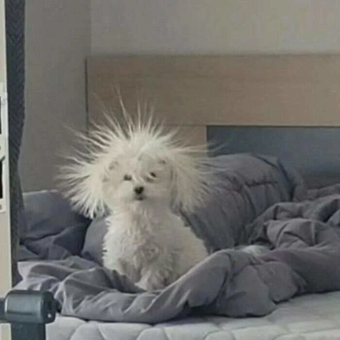 8. Наш пёс активно играл на диване, и его шерсть сильно наэлектризовалась