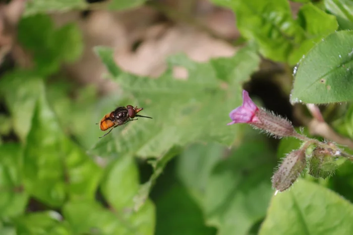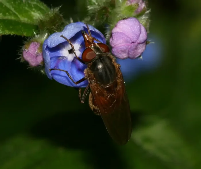 Большинство мух-журчалок имеют короткие и расширяющиеся книзу хоботки, которыми удобно хлебать пролитый на пол чай, варенье, жидкие отходы и сок с разрезанных апельсинок. Некоторые из них приспособились потребл*ть нектар или пыльцу из цветков с коротким венчиком, но только рингии с их огромными хлюпалками способны вкусить нектара из любых цветков по своему желанию. И, между делом, опылить их. Осталось лишь выяснить: как они с такими огромными штуковинами летают?
