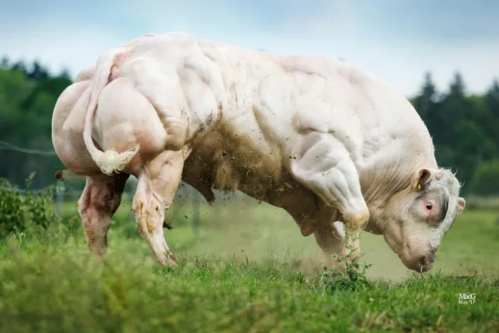 Например, бельгийская голубая корова. Заметили такую? Это не просто корова, а настоящая гора мышц. Причиной этого стало естественное изменение в гене миостатина, произошедшее в результате селекции.