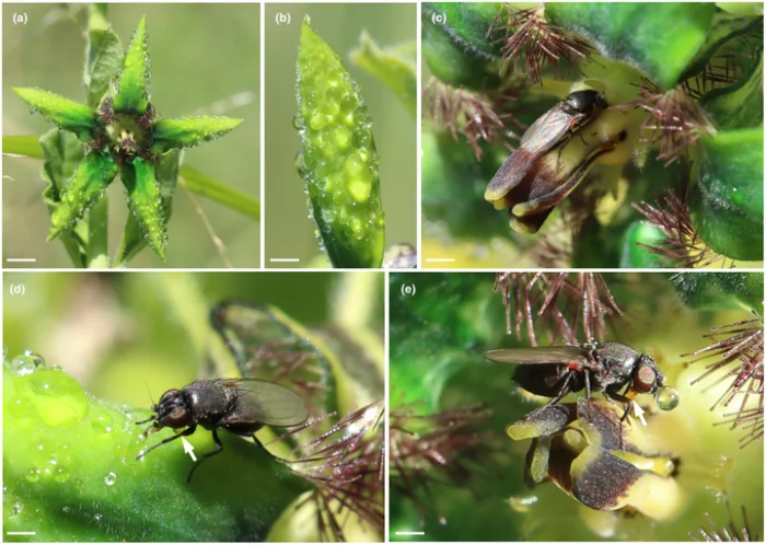 Южноафриканский цветок Церопегия опыляется мухами, которые высасывают гемолимфу из насекомых. Чтобы привлечь насекомых, цветок научился пахнуть, как раненая пчела. Теперь автору тоже интересно, как пахнет раненая пчела.