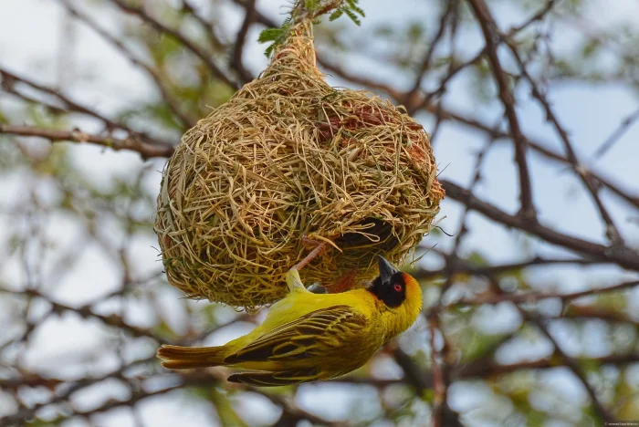 Африканский ткачик — настоящий мастер строительства. Эти птицы создают сложные гнёзда из травы, которые могут быть как одиночными, так и огромными коммунальными комплексами, где живут десятки семей. Интересно, что самец строит гнездо, чтобы привлечь самку: он демонстрирует свои навыки, а она внимательно проверяет качество конструкции.