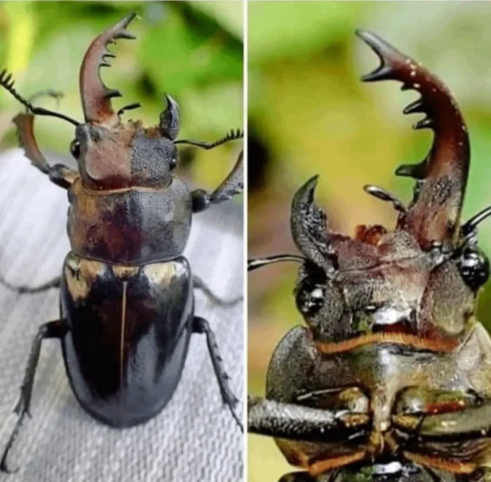 На фотографии изображён крайне редкий экземпляр жука-оленя — билатеральный гинандроморф, у которого левая половина тела самца, а правая самки. Это не просто окраска — каждая сторона обладает полностью соответствующими половым анатомическим признакам.