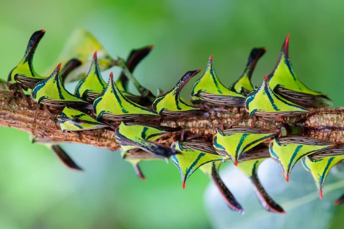 Эта цикадка имеет совершенно инопланетный вид, с выростом, напоминающим колючку акации или шип розы. Это идеальный камуфляж от птиц. Но самое удивительное, что форма "рога" отличается у разных популяций в зависимости от растений, среди которых они живут. Самка остается охранять яйца после кладки и кормит личинок, прокалывая кору растения, чтобы они пили сок.