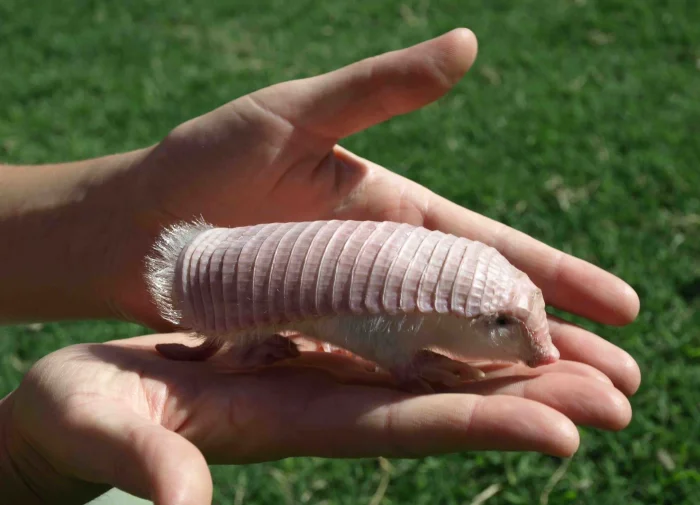 Прозвище "розовая фея" очень подходит этому существу. Его панцирь нежно-розового цвета, из-за просвечивающих кровеносных сосудов, и покрыт мягкими белыми волосками. Это идеальный камуфляж в песчаных дюнах Аргентины. Плащеносный броненосец благодаря мощным когтям может моментально закопаться в песок.