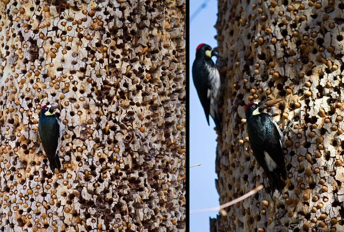 Кстати, о кладовых. Это визитная карточка желудевых дятлов. Представьте себе огромное старое дерево, в котором выдолблены десятки тысяч маленьких дырочек, и в каждой дырочке спрятан жёлудь. Самые большие деревья насчитывают до 60 000 желудей! Настоящий ад для трипофоба. Чтобы выдолбить одно такое отверстие, у дятла уходит до 20 минут. Кланы птиц поколениями долбят дырочки на своих деревьях.