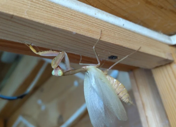 Процесс линьки занял у неё несколько часов, и вскоре из укрытия появилась преображённая красавица в бежевом наряде (хотя до этого её окрас был зеленоватым – эти насекомые обладают способностью частично менять цвет, подстраиваясь под окружающую среду). Теперь её размер увеличился примерно вдвое.