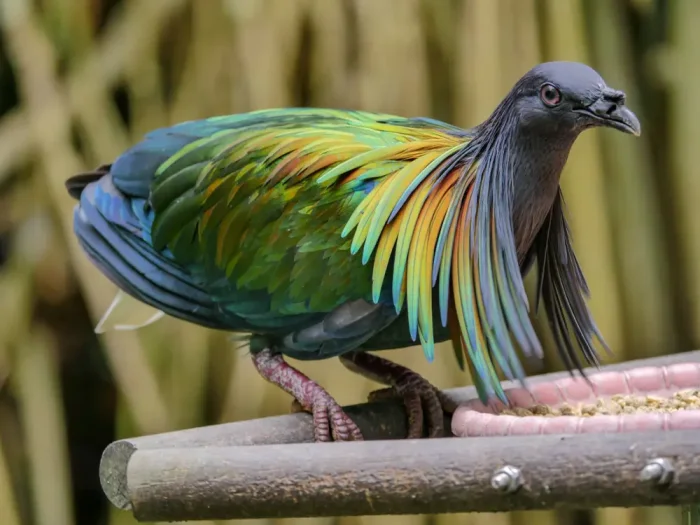 Этот редкий вид с металлическим оперением и длинными перьями на шее обитает только на Андаманских и Никобарских островах. Учёные считают его ближайшим современным родственником вымершей птицы додо.