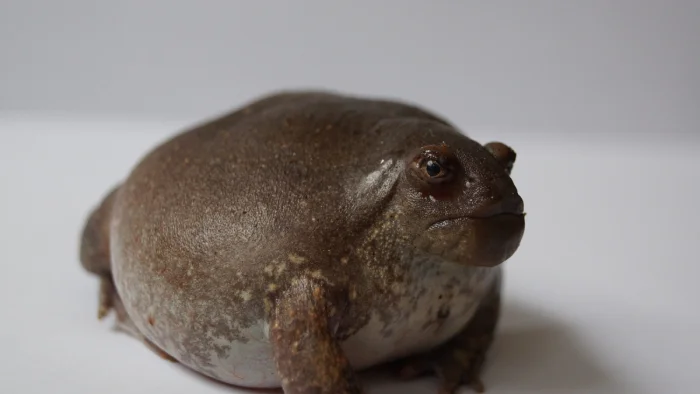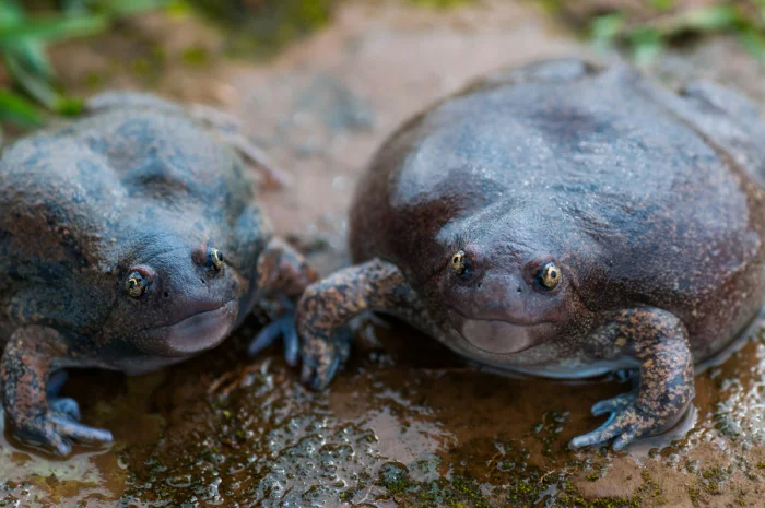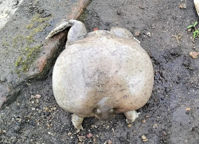 Наше удивление вполне оправданно — достаточно взглянуть на фотографии! Представьте себе крохотную голову с плоской мордой, словно лягушка приземлилась прямо на асфальт, тонкие короткие лапки и огромное шарообразное туловище. При длине всего 6 сантиметров и весе около 30 грамм, это существо выглядит как беззащитный, жирненький комочек. У него нет ни яда, ни шипов, ни маскировочной окраски — ничего, что могло бы его защитить. Они даже прыгать не умеют, передвигаясь мелкими шажками или вплавь.