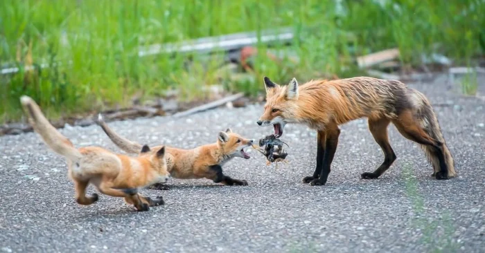 Лисица предъявляет к партнёру высокие требования: постоянно подгоняет его, чтобы приносил больше пищи. А малыши выхватывают добычу прямо из его пасти.