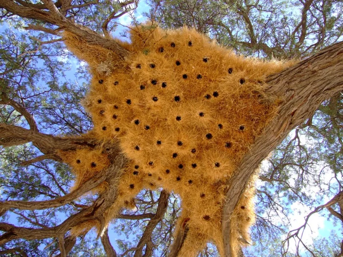 Наиболее крупные и густонаселённые птичьи гнёзда создаёт общественный ткач (лат. Philetairus socius). Эта птица обитает в засушливых саваннах Юго-Западной Африки и известна своими уникальными строительными способностями. Коллективное гнездо, которое она возводит, поражает своими размерами: оно может достигать восьми метров в длину и двух метров в высоту. Внешне такое сооружение напоминает огромный стог сена, свисающий с дерева или столба. Внутри него располагается до 300 отдельных гнёзд, каждое из которых занимает пара ткачей и их потомство. Иногда такие массивные конструкции становятся настолько тяжёлыми, что дерево, служащее опорой, не выдерживает нагрузки и ломается под их весом.