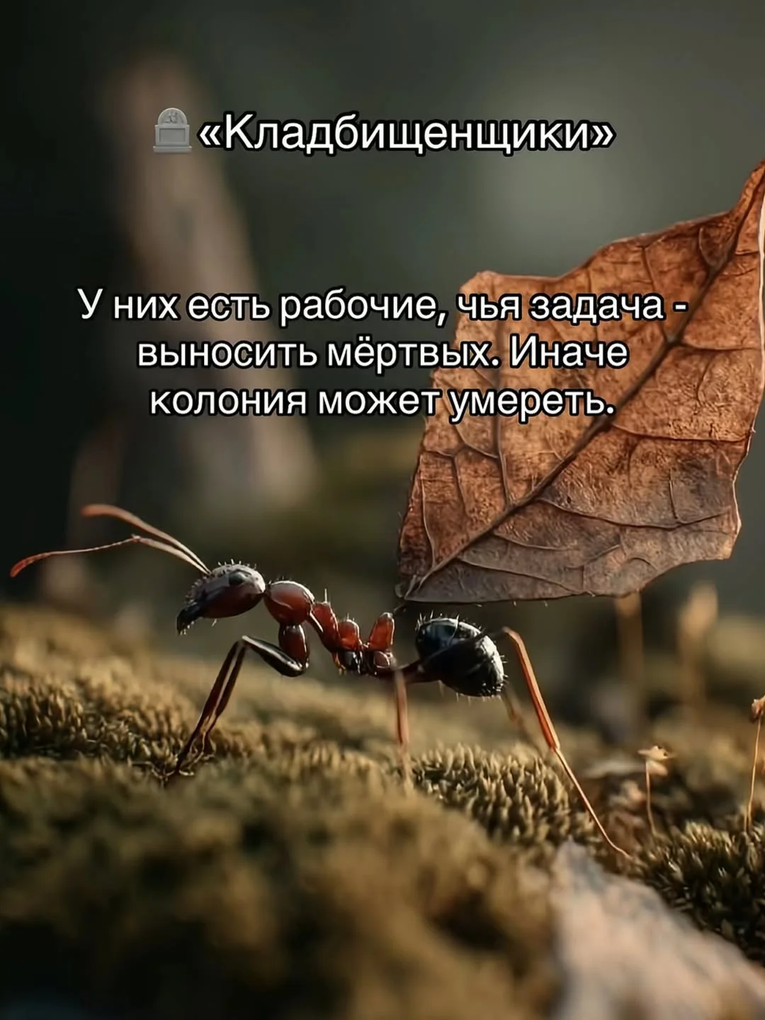 Внутри муравейника существует чёткое разделение труда. Есть рабочие, солдаты, разведчики и особи со специализированными функциями. Например, так называемые «кладбищенщики». Это рабочие муравьи, чья задача — выносить мёртвых сородичей за пределы гнезда. Если этого не делать, в колонии быстро распространяются грибки и болезни, способные уничтожить весь муравейник. Смерть здесь — не трагедия, а рабочий процесс, встроенный в систему выживания.
