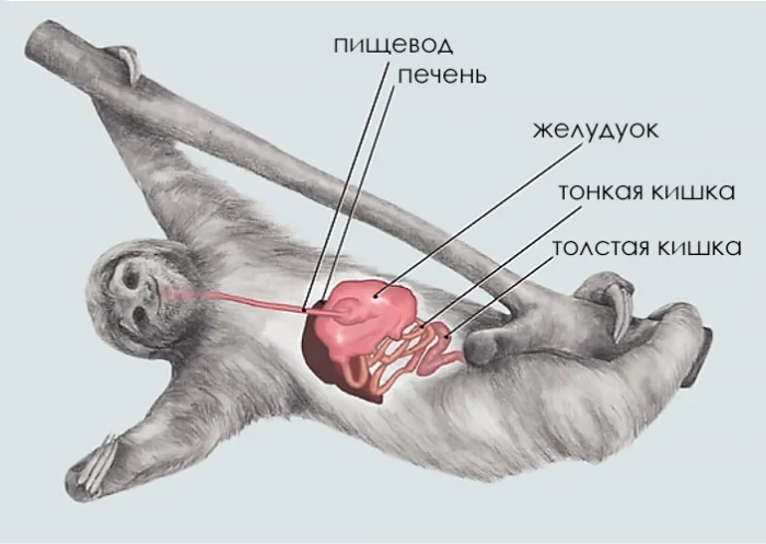 У ленивцев внутренние органы расположены крайне необычно для млекопитающих. Печень повернута к спине и отделена от брюшной стенки желудком. Селезёнка и поджелудочная железа смещены вправо, а сам желудок отличается огромными размерами.