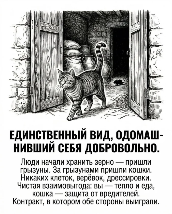 Фактически кошка — единственное животное, которое «одомашнило себя» добровольно. Это был своеобразный контракт: человек получал защиту от вредителей, а кошка — доступ к пище и теплу. И этот союз оказался настолько успешным, что сохранился до наших дней.