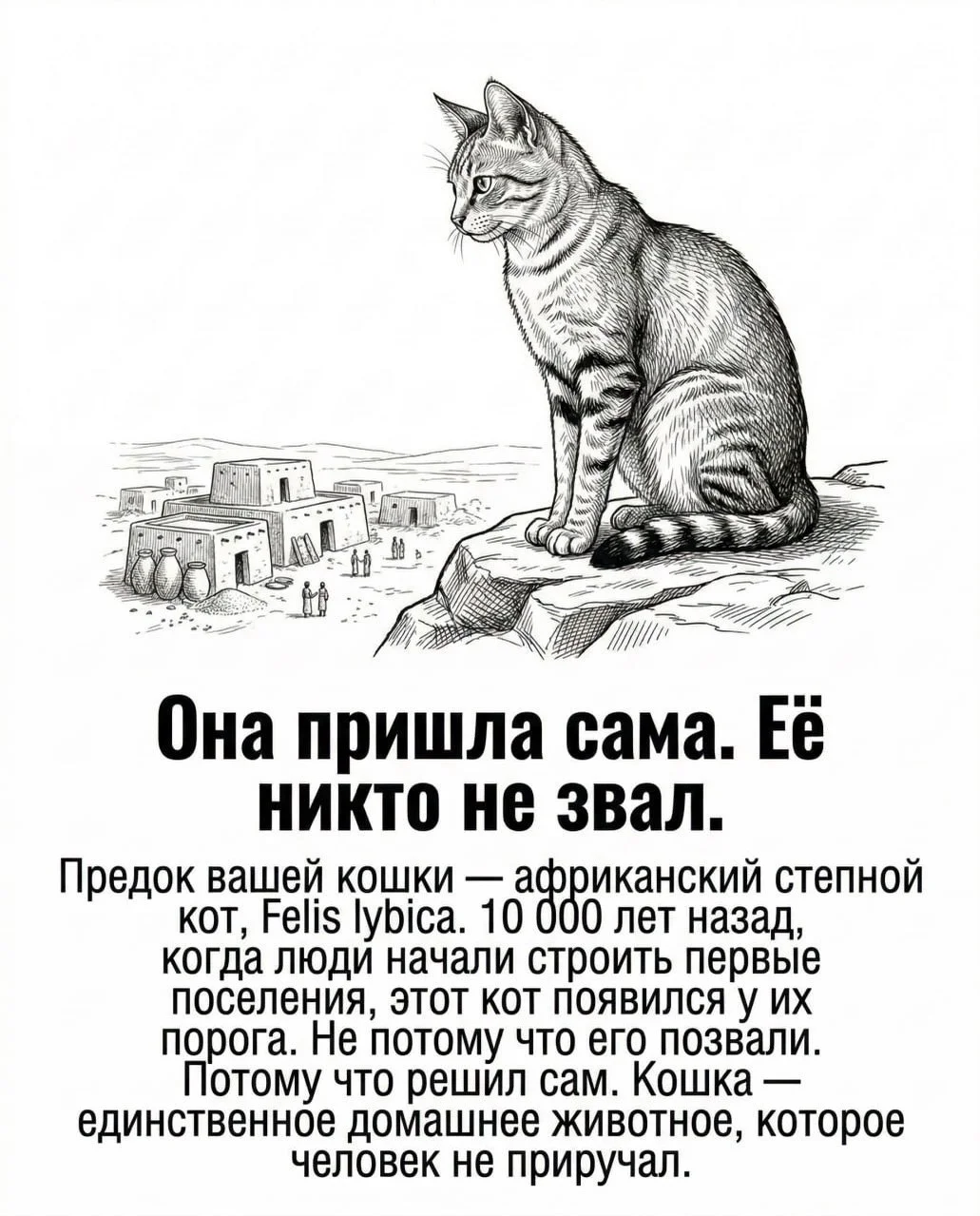 История отношений человека и кошки началась около 10 тысяч лет назад. Предком современной домашней кошки считается африканский степной кот. Когда люди начали строить первые поселения и хранить зерно, туда пришли грызуны. А вслед за ними — кошки. Но важно понимать: их никто не приручал специально. Они сами выбрали жить рядом с человеком, потому что это было выгодно.