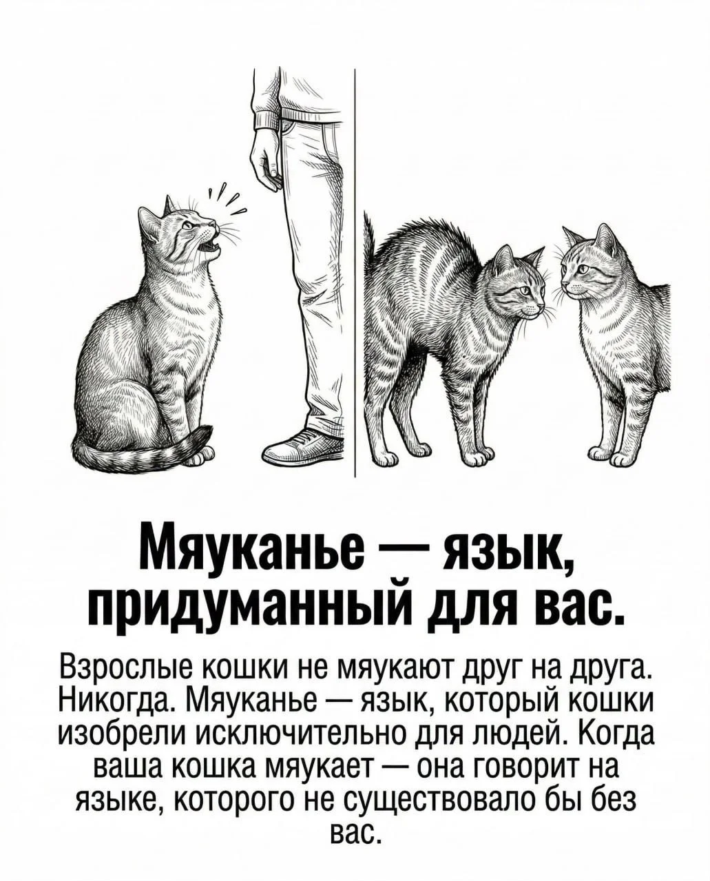 Мяуканье — ещё один пример. Взрослые кошки почти не мяукают друг с другом. Этот «язык» они используют в основном для общения с человеком. По сути, кошка создала отдельный способ коммуникации, чтобы лучше взаимодействовать с нами.