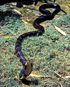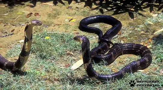 Королевская кобра, или гамадриад (Ophiophagus hannah) является самой крупной ядовитой змеей в мире. Длина взрослых королевских кобр в среднем составляет примерно 3-4 метра, однако изредка некоторые особи могут достигать поистине внушительных размеров - около 5,5 метра. Королевская кобра - очень красивая змея. Я бы даже назвал её одной из самых привлекательных представителей подотряда змей (Serpenets). Она настолько же грациозна, насколько и убийственно, так что королевской кобре вполне подходит эпитет "смертоносной красавицы". Копюшон королевской кобры не так широк, как у кобр рода Naja. Туловище королевской кобры стройное и упругое, что характерно для всех аспидовых змей. Молодые особи окрашены ярче, чем взрослые. Яд у королевских кобр очень токсичный (хотя есть змеи с гораздо более токсичным ядом) и его так много, что бывали даже случи гибели индийских слонов от укуса этих змей. Как и все кобры, гамадриады - очень быстрые змеи, которые охотятся не только из засады, но и активно преследуют своих жертв. Добычей этой змее служат чаще всего другие змеи, в том числе и очень ядовитые, такие как крайты, аспиды, кобры из рода Naja, а также крупные ящерицы и т.п. Королевская кобра ведёт назменый образ жизни, однако она прекрасно лазает по деревьям и превосходно плавает. Ведёт королевская кобра преимущественно дневной образ жизни. Перед откладываением яиц самка сооружает из веток и листьев гнездо, в которое откладывает примерно от 20-ти до 40-ка яиц. Самка ревностно охраняет кладку и горе тому, кто окажется вблизи от её гнезда. После вылупления детёнышей из яиц самка королевской кобры, как и все змеи, покидает их, и с этой минуты змеёныши должны заботиться о себе сами. Некоторые люди несправедливо считают королвскую кобру очень агрессивной змеёй, однако она нападает на человека лишь в случае самозащиты или защиты потомства.