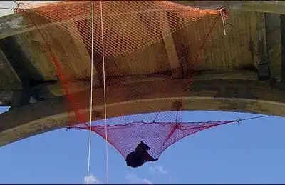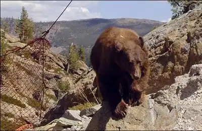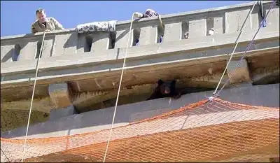 Медведица испугалась автомобиля и попыталась спрыгнуть с моста.