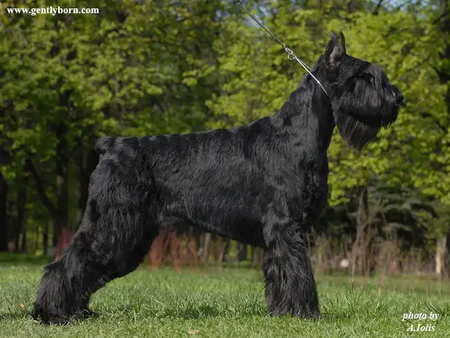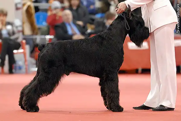 Собака крепкого сложения, почти квадратного формата. Высота в холке кобеля — 65-70 см, суки — 60-65 см. Голова прямоугольная, массивная. Переход от лба к морде умеренный. Морда мощная, тупая, мочка носа черного цвета. Уши высоко посажены (часто купируют). Шея сухая, мускулистая, высоко поставлена. Грудь мощная, овальной формы. Спина прямая. Поясница короткая. Круп немного опущен. Хвост высоко поставлен, купируют, оставляя до трех позвонков. Лапы короткие, круглые, компактные. Шерсть жесткая, проволокообразная. На морде сильно развитые усы, борода и косматые брови. Окрас: сплошной черный или «перец с солью».