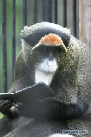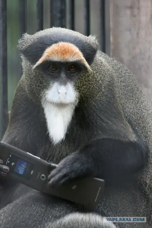 Злая макака в в стремительном рывке овладела телефоном расслабившегося туриста. Не подходите к клеткам близко!