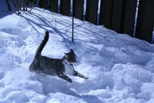 Городские киски видят снег только из окна, а деревенские развлекаются по полной. Разнообразие зимних кошачьих видов спорта поражает, это и сноупрыгинг и сноуползинг он же сноукрадинг, сноуловинг мышей да всего и не перечислишь.