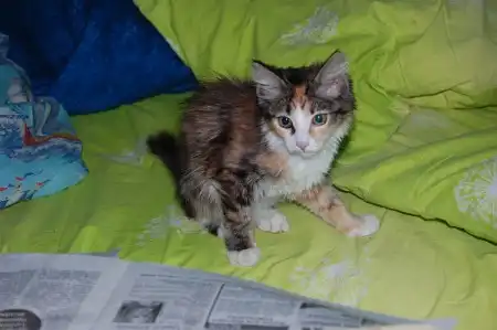 Симпатичная трехцветная кошка, очень любит играть, ласковая, приучена к туалету очень нуждается в заботливом хозяине. Сами бы оставили, но у нас взрослый кот, ее третирует;-)