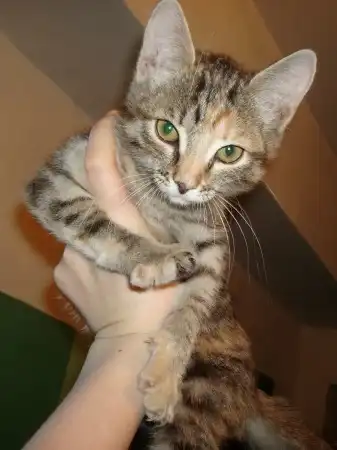 Хищный взгляд, очень красивая трехцветная шёрстка. Котёнок ласковый и хочет любви и тепла!