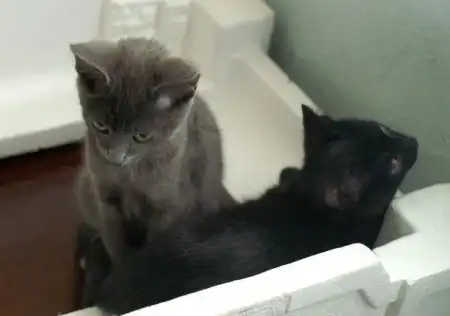 Найдены котята в подъезде - судя по всему брат с сестрой, уж больно похожи и дружны. Сестричка дымчатая с беленькой "бабочкой" на груди, братишка - черненький с такой же "бабочкой". Возраст примерно 3 месяца. Девчонка уже продемонстрировала свои умственные способности: оторвала кусочек бумаги от валявшегося конверта, скомкала и погнала по квартире. Мальчонка просто пропитан любовью ко сну в удобном кресле. Разговаривают исключительно ультразвуком, приятно вибрируют при чесании загривка. Ультразвук переходит на более низкие частоты при попытке постирать котов, но попытка осуществлена успешно, причём использован инсектицидный шампунь и впихана антиглистная таблетка. Итак. Я более чем уверена, что Вы уже не можете прожить без этих чудесных "родственников" или хотя бы без одного из них. Тогда звоните: 8-913-811-8350, Ольга. Доставка на дом осуществима.