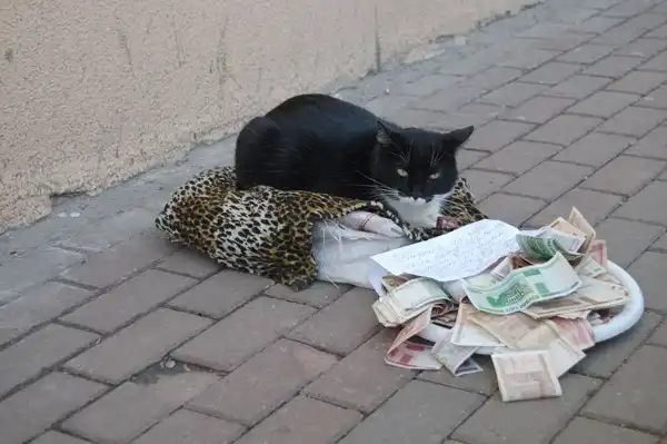 Этот кот был замечен в одном из городов Беларусии. Он сидел с запиской: "Нужны деньга на мясо и рыбу". Хозяин кота - бабушка, которая спасла кота. Тек как у нее были еще животные она не смогла кормить их всех, поэтому она решила, чтобы животные зарабатывали деньги сами для себя.