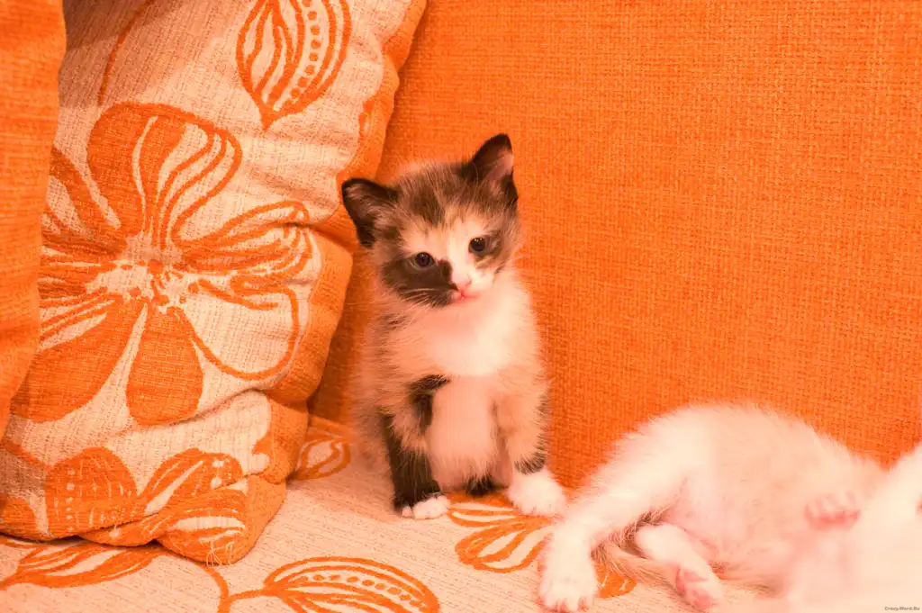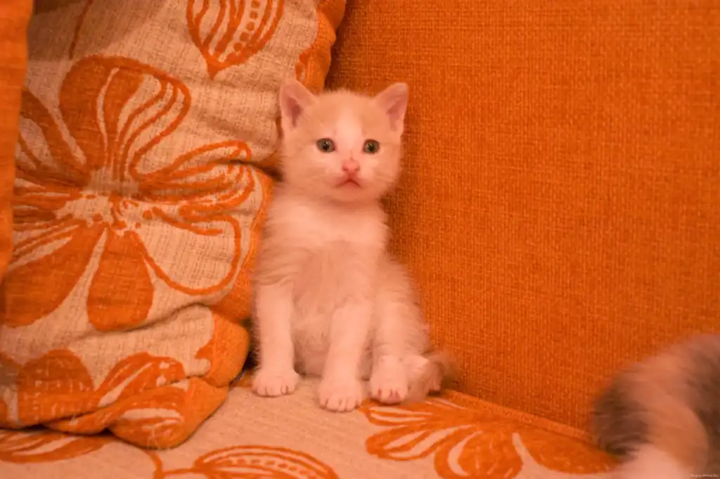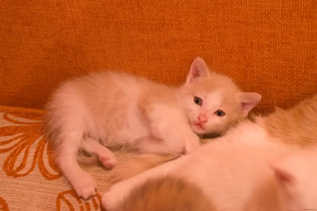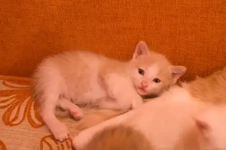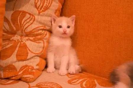 котенок первый. Кот, окрас белый с рыжим, котенок любознательный, активный, игривый и непоседливый.