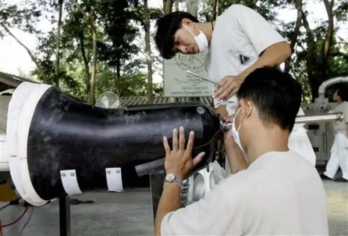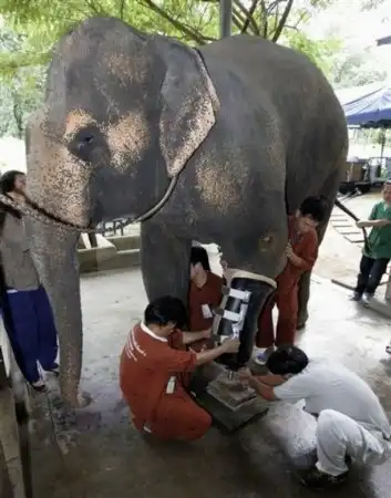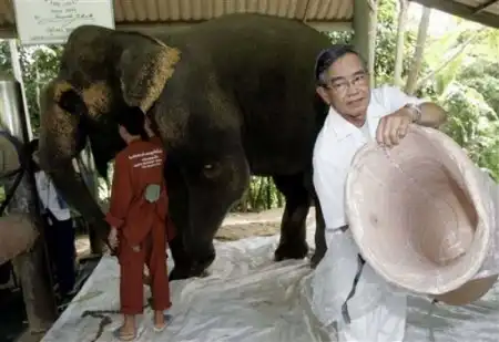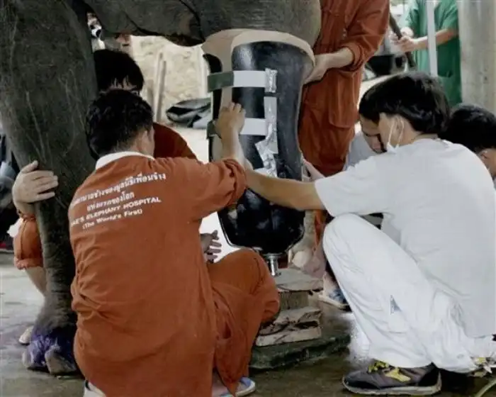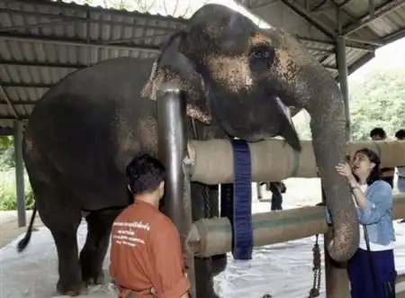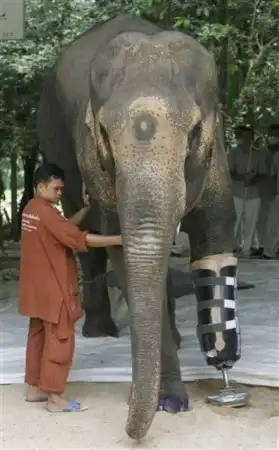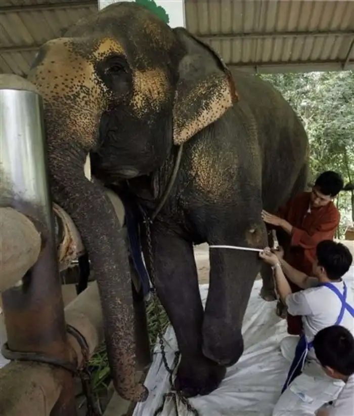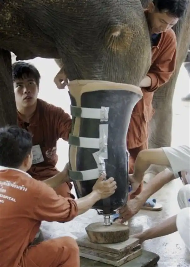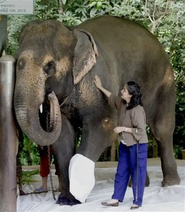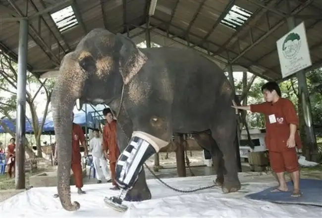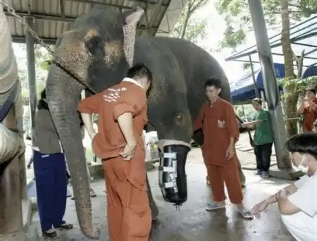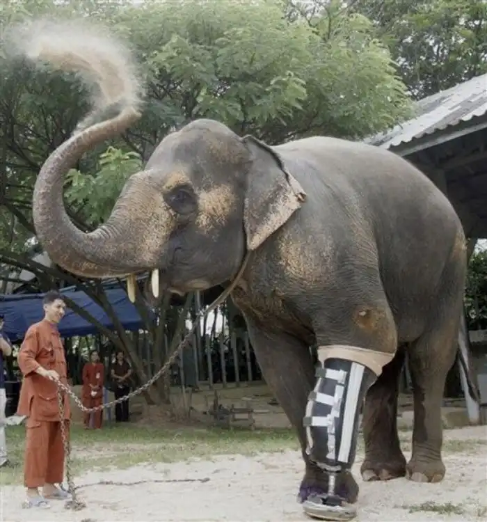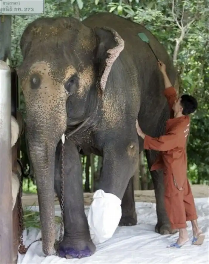 Слониха Мотола потеряла ногу 10 лет назад, после того, как наступила на мину. Недавно ей исполнилось 48 лет и в подарок работники тайской ветеринарной больницы преподнесли ей настоящий протез. Слониха, наверное, счастлива.)