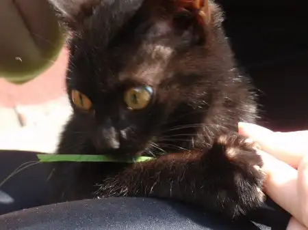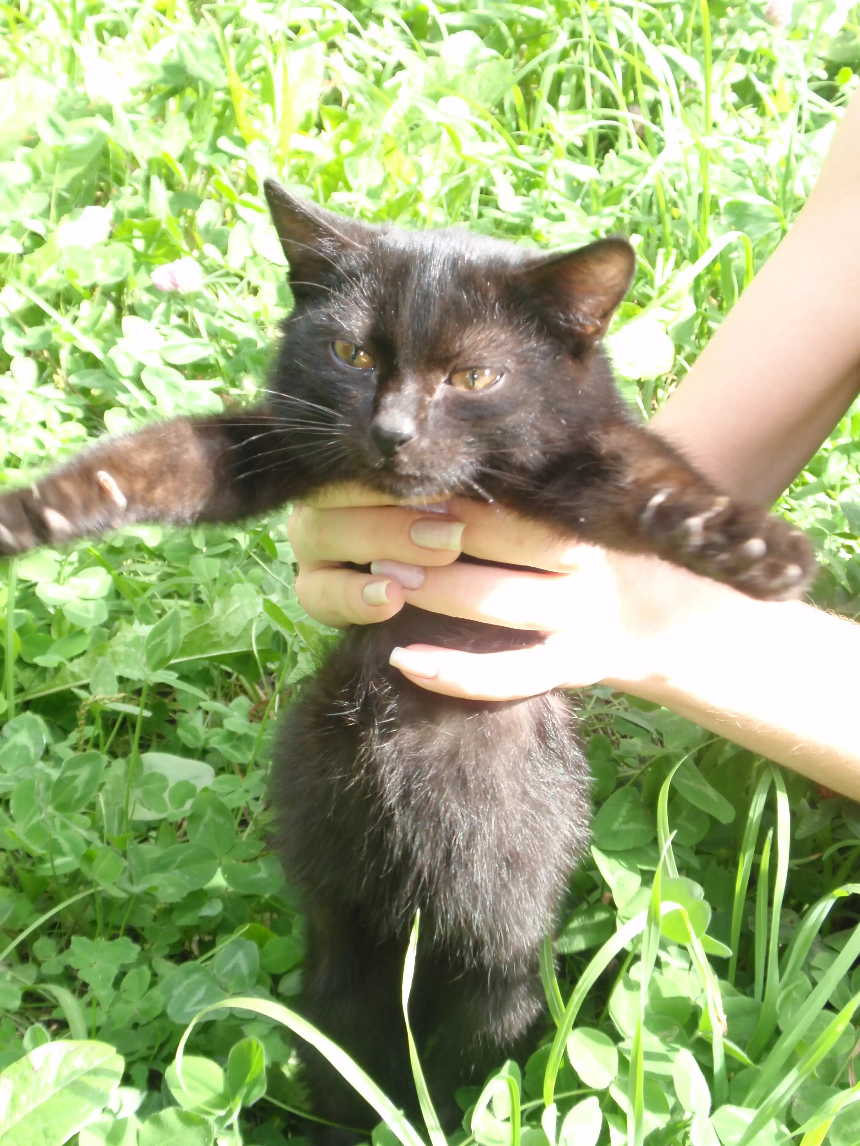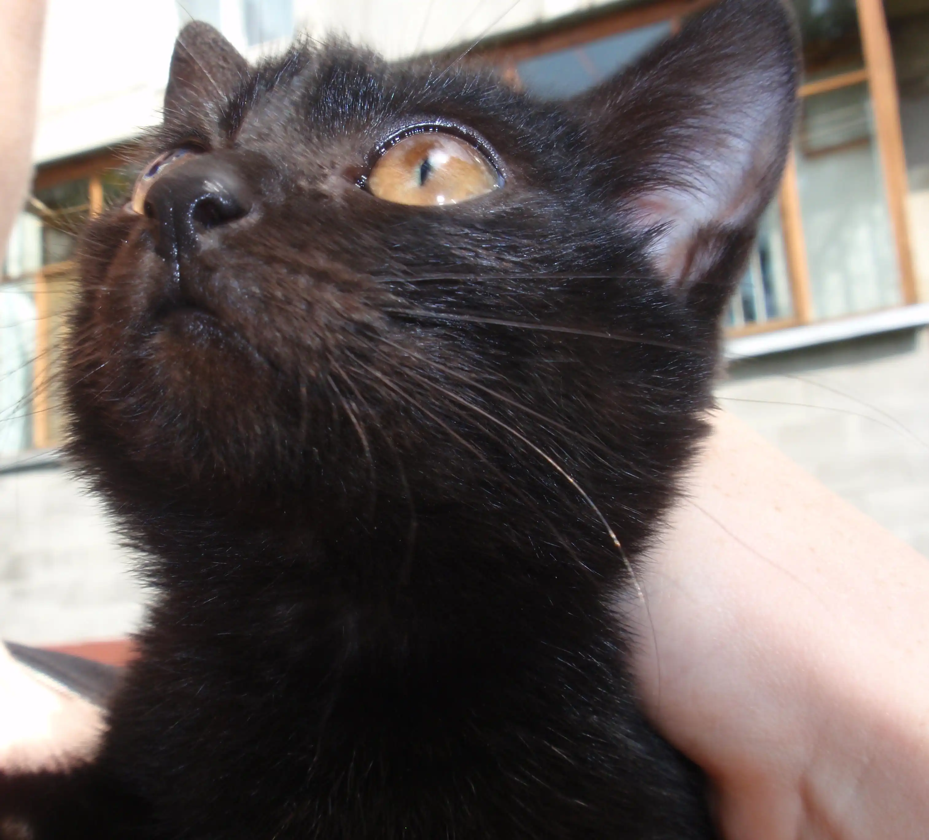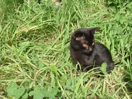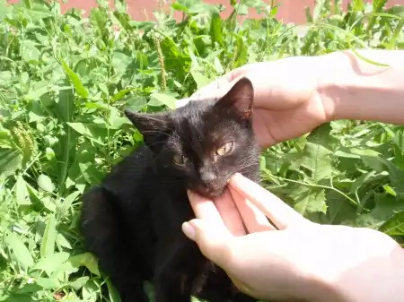 Котенок был выброшен в лес "добрыми людьми" на голодную смерть, затем найден нашими не менее "добрыми" соседями, которые, вдоволь наигравшись, выкинули котенка на улицу. Пока он живет в подвале нашего дома, мы его кормим, но себе оставить не можем, так как есть две кошки (одна из которых несколько лет назад также была подобрана с улицы, кстати тоже черная).