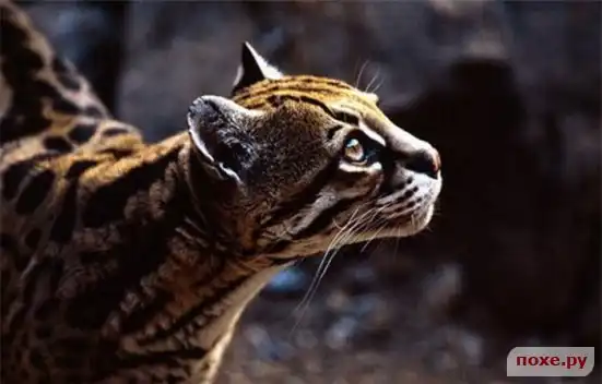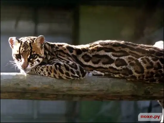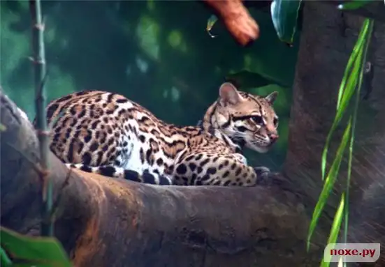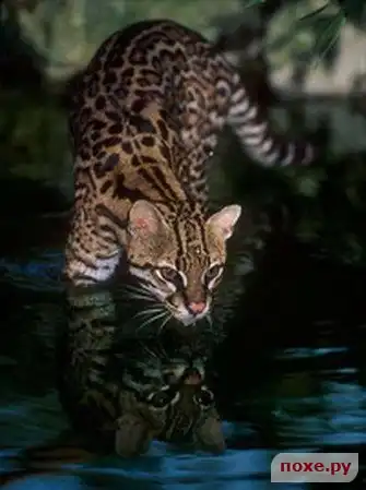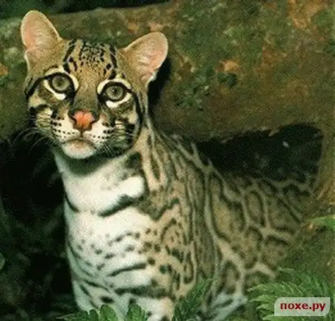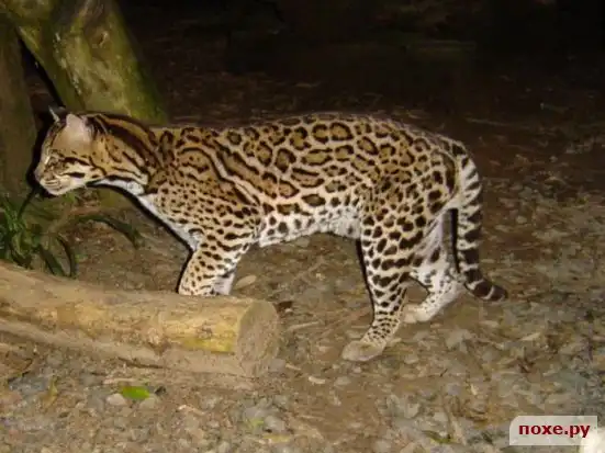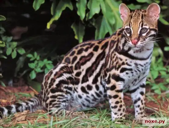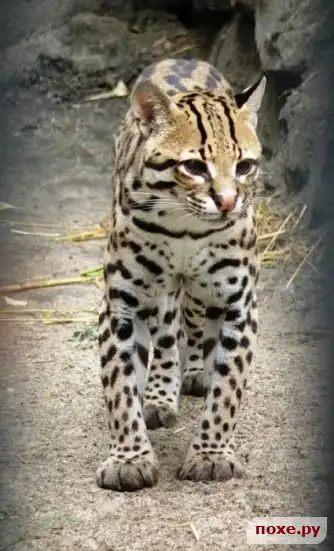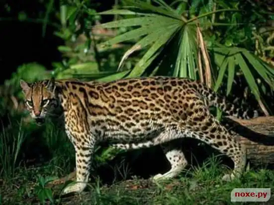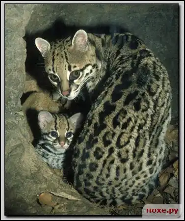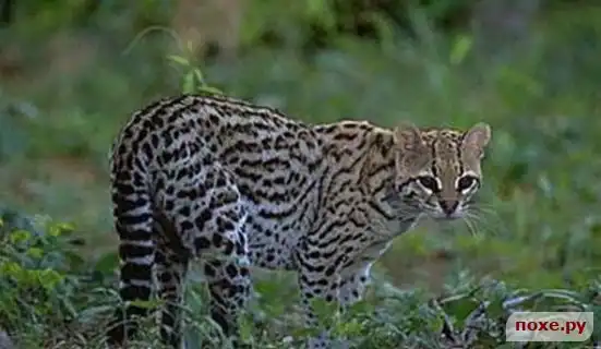 Хищное млекопитающее рода кошек. Длина тела до 1 м, хвоста - около 30 см, высота в плечах до 50 см. Голова, удлинённая с округлёнными ушами. На лбу и щеках по 2 чёрные полосы. Основной фон меха жёлтый или серый с чёрными продольными полосами или кольцами пятен, совсем круглых на ногах. Грудь и брюхо кремового цвета. Оцелот распространён от южной части США до Патагонии. Обитает в лесах и густых кустарниках. Охотится в сумерках и ночью на обезьян, грызунов, птиц, пресмыкающихся, домашнюю птицу. Хорошо лазает по деревьям. Спаривание в июне или в октябре. Детёныши (обычно 2) родятся в октябре или январе. Численность резко сокращается, так как оцелот служит объектом охоты (из-за ценного меха).