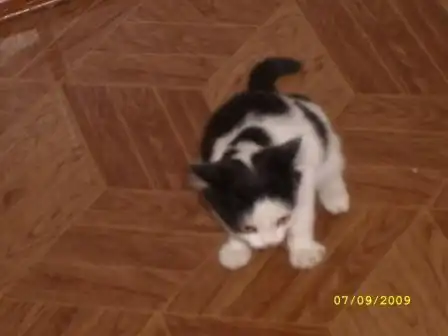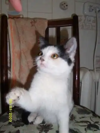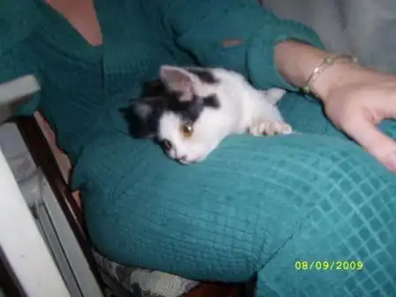 мы его взяли...и он преобразился: за грязной шерстью скрывалась кипельно-белый окрас с черными пятнами.....накормили его (это мальчик, примерно 2-2,5 месяца) до отвала - и он стал похожим на колобка: косолапый и круглый)