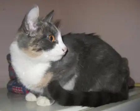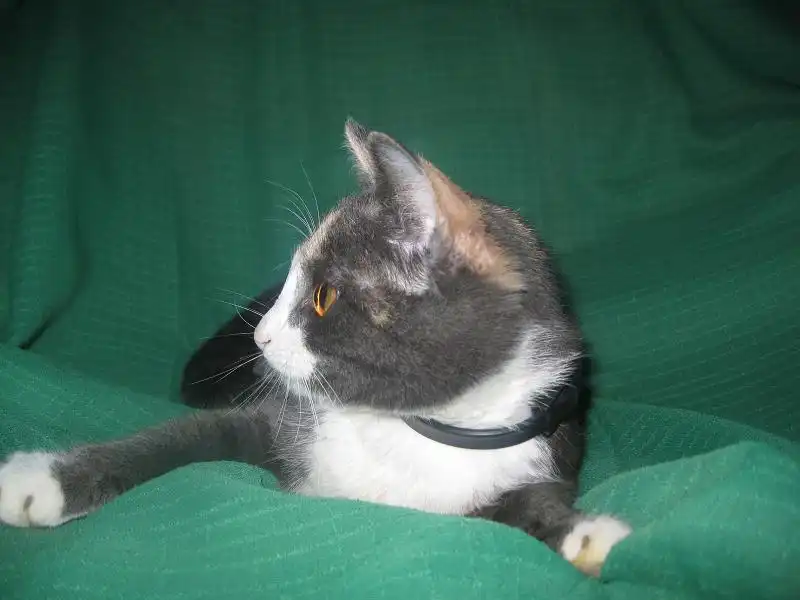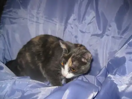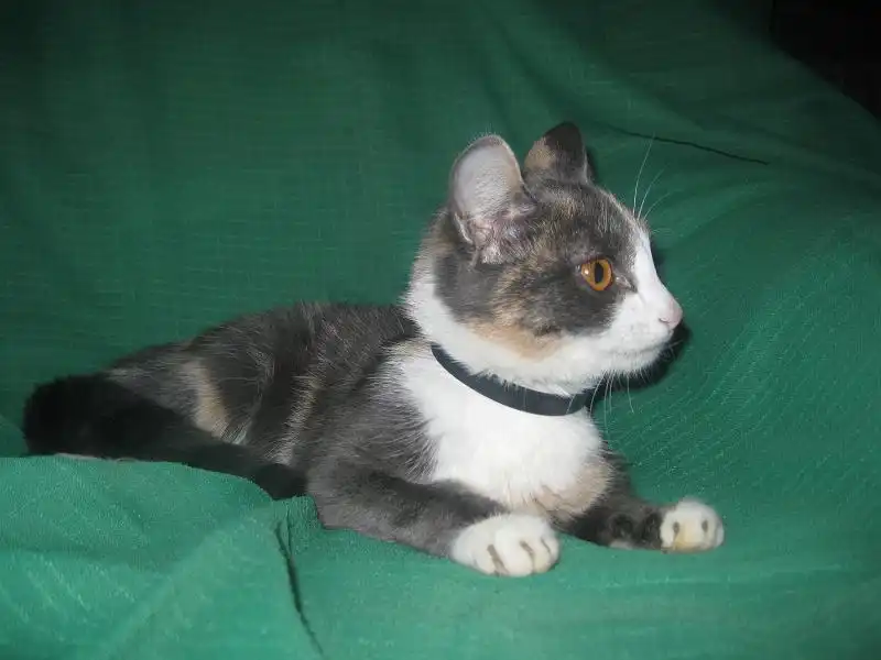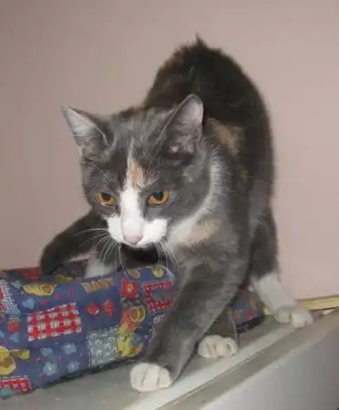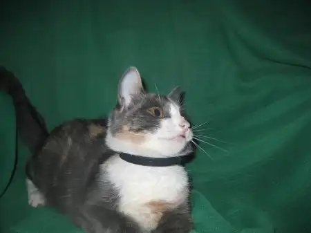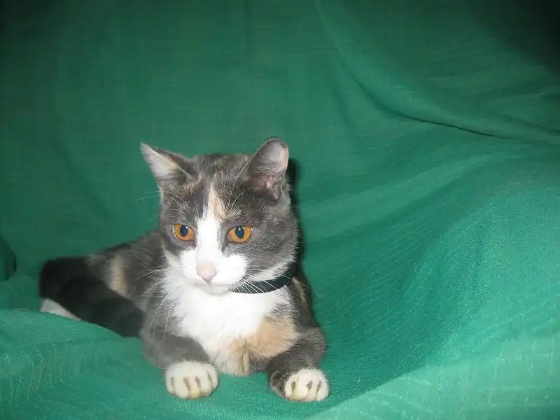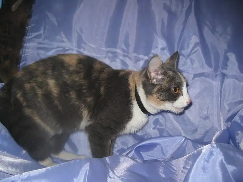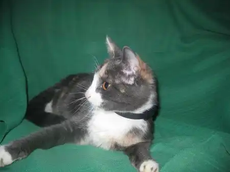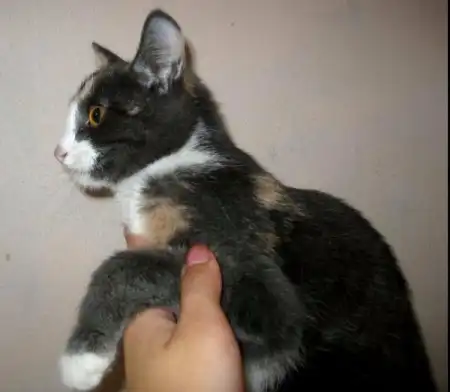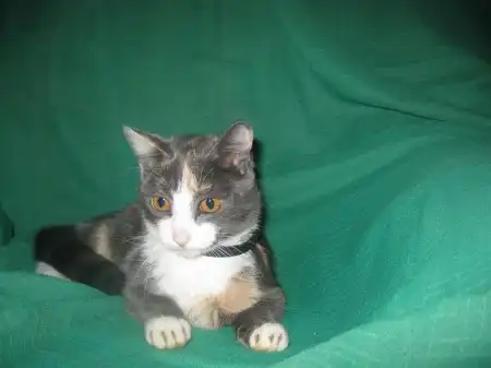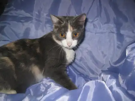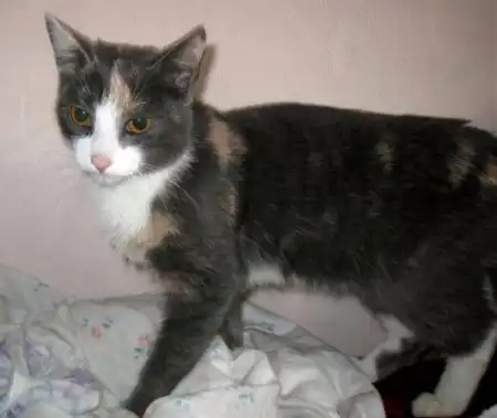 Роксана - кошечка месяцев 9-10, удивительного четырехцветного окраса, розовые и голубые пятна на спине совершенно симметричны относительно позвоночника, как будто нарисованы, на шее переходят в белый воротник, застегивающийся розовой застежкой на груди. Получается очень красивый бархатный наряд для нашей великолепной юной леди, явившейся на карнавал в таинственной голубой маске. Этот наряд заверщает голубой с черными полосками шлейф в виде хвостика и изящные белые туфельки на лапках. Кошечка очень милая, нежная и ласковая, спокойная, ненавязчивая. Лотком пользуется, ест хорошо и сухой корм, и натуральную пищу. Была подброшена в подвал на рынке, болела, но с болезнью удалось справиться, и теперь она может предстать во всем своем великолепии.