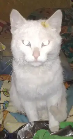 Найден котик в районе Южной.Глаза голубые, сам белый, не кастрированный.Очень ласковый, послушный, хороший аппетит, с лотком дружит.Себе остваить,к сожалению, не могу.