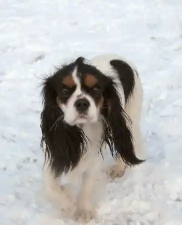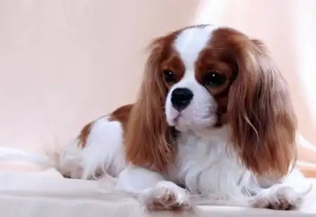 У кавалер Кинг Чарльз спаниеля средней длинны шерсть,не нуждающаяся в стрижке,длинные шелковистые уши и большие трогательные глаза.