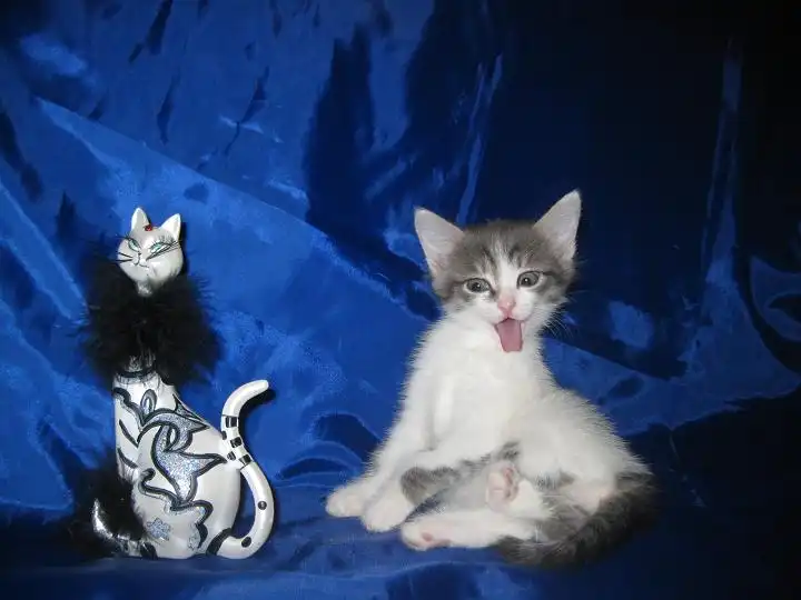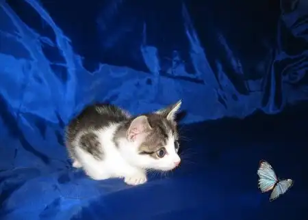 Пуговка, 1 мес.3 недели, окрас белый с голубоватыми пятнами, крупненькая, прожорливая, спокойная засонечка. Лоточек освоила, но надо последить.